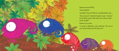 Kapila Aunty is teaching the little chameleons how to change colour, one at a time. But Kamini gets excited and goes red, purple, green, yellow . . . she just can’t stop! The flashy-splashy third story in the ever popular series about Bahadur the baby elephant!